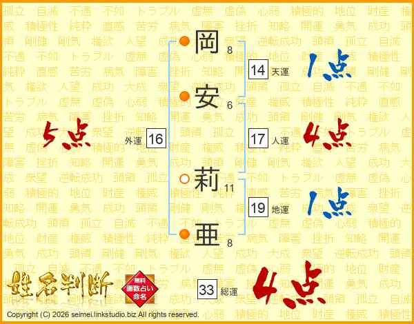 岡安莉亜さんの総運は33画の4点!