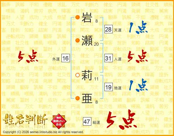 岩(8画)瀬(20画) 莉(11画)亜(8画)