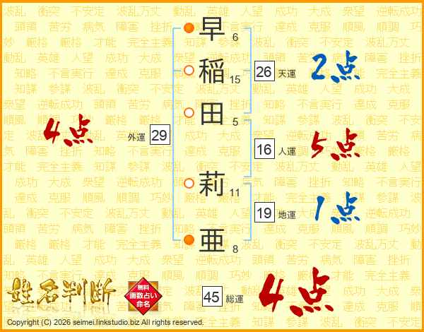 早稲田莉亜さんの総運は45画の4点!