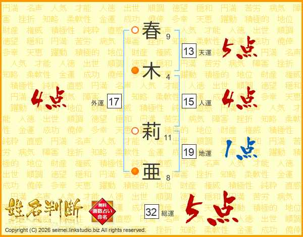 春木莉亜さんの総運は32画の5点!