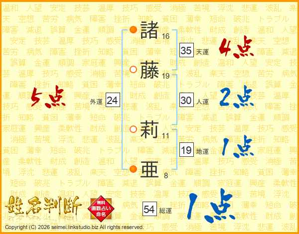 諸(16画)藤(19画) 莉(11画)亜(8画)