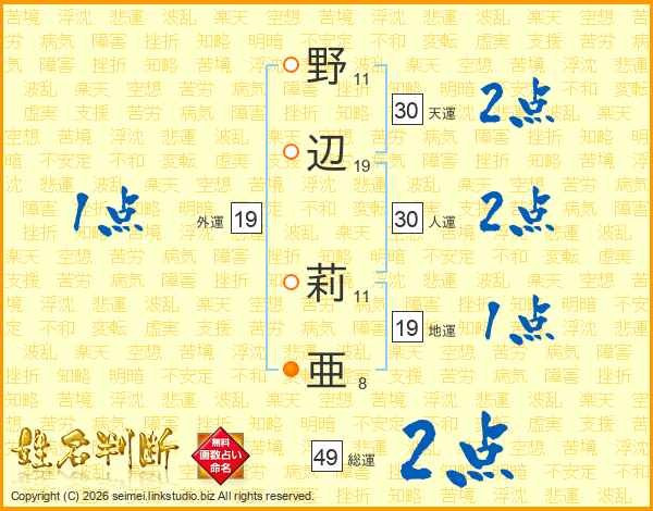 野(11画)辺(19画) 莉(11画)亜(8画)