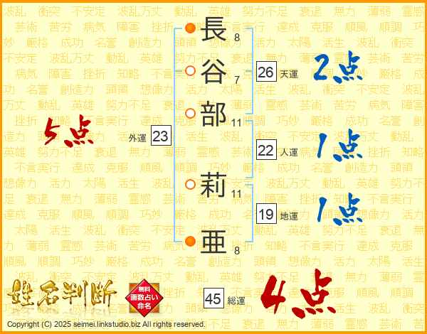 長(8画)谷(7画)部(11画) 莉(11画)亜(8画)