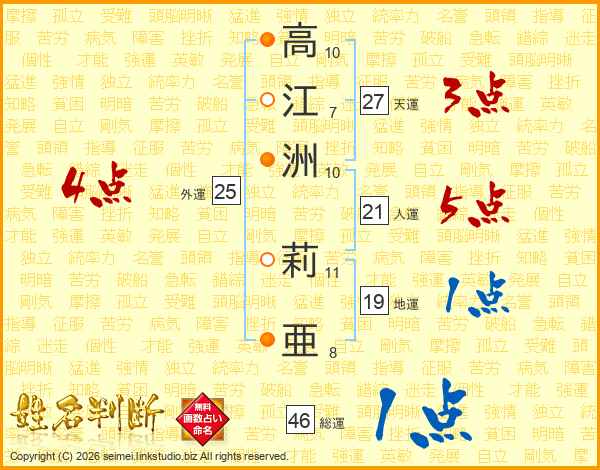 高(10画)江(7画)洲(10画) 莉(11画)亜(8画)