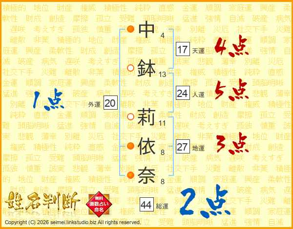 中鉢莉依奈さんの総運は44画の2点!