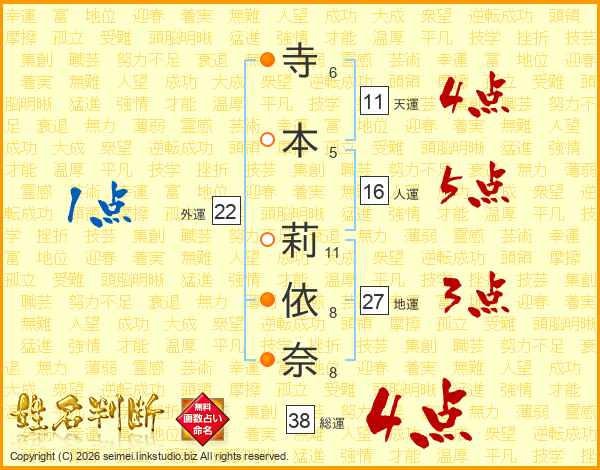 寺(6画)本(5画) 莉(11画)依(8画)奈(8画)