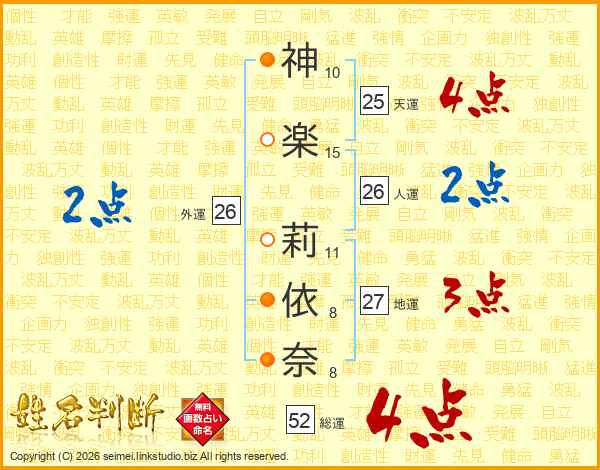 神(10画)楽(15画) 莉(11画)依(8画)奈(8画)