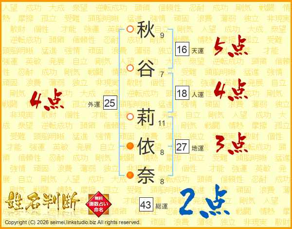 秋谷莉依奈さんの総運は43画の2点!