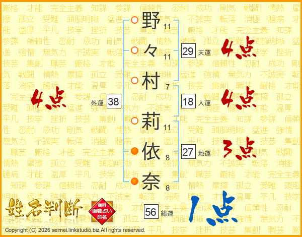 野(11画)々(11画)村(7画) 莉(11画)依(8画)奈(8画)