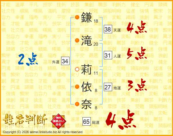 鎌(18画)滝(20画) 莉(11画)依(8画)奈(8画)