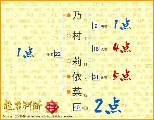乃(2画)村(7画) 莉(11画)依(8画)菜(12画)
