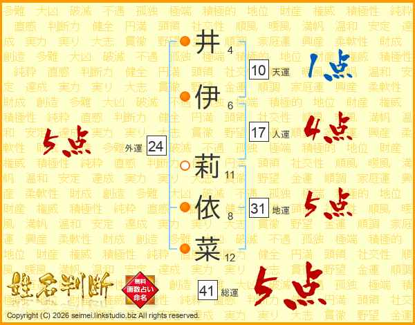 井(4画)伊(6画) 莉(11画)依(8画)菜(12画)