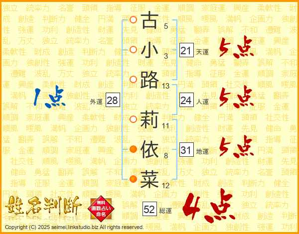 古(5画)小(3画)路(13画) 莉(11画)依(8画)菜(12画)