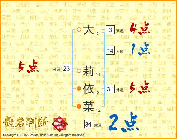 生活面を象徴する運勢です。外部から受ける影響力を表し、結婚運、家庭運や職場、環境への順応性を表します。総運から人運を引いた画数。姓や名が1文字の場合を除く。