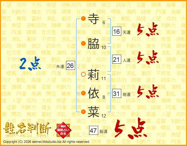 寺(6画)脇(10画) 莉(11画)依(8画)菜(12画)