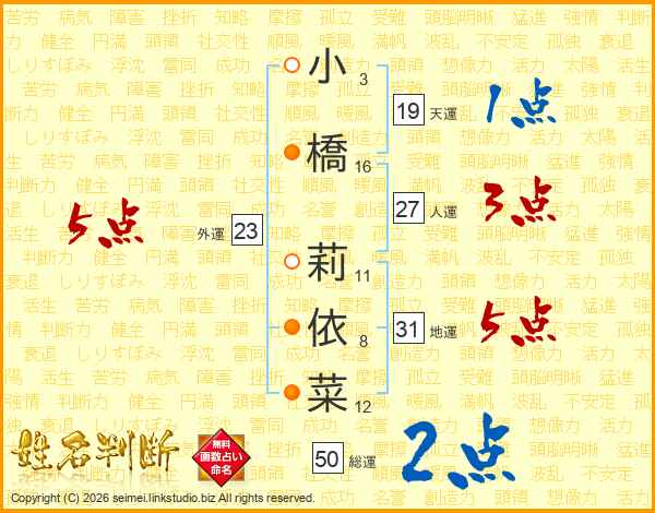 小(3画)橋(16画) 莉(11画)依(8画)菜(12画)
