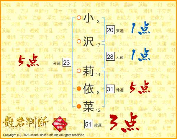 小(3画)沢(17画) 莉(11画)依(8画)菜(12画)