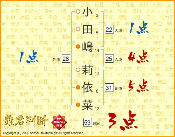 小(3画)田(5画)嶋(14画) 莉(11画)依(8画)菜(12画)