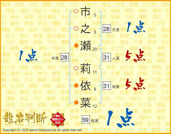 市(5画)之(3画)瀬(20画) 莉(11画)依(8画)菜(12画)