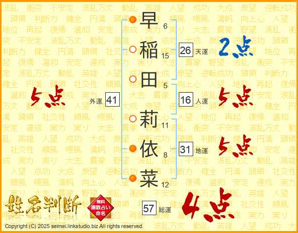 早(6画)稲(15画)田(5画) 莉(11画)依(8画)菜(12画)