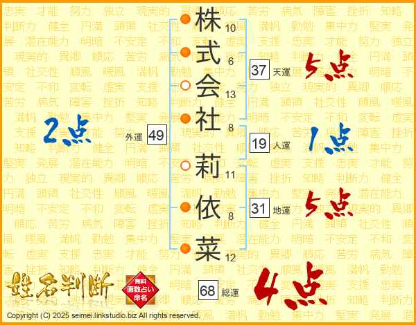 株(10画)式(6画)会(13画)社(8画) 莉(11画)依(8画)菜(12画)