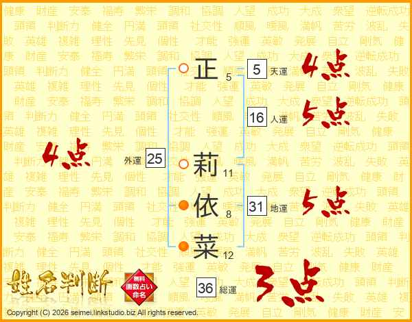 あなたの人生を表す1番重要な運勢です。生涯を通じて影響する総合運となり、主に50歳以降の晩年期に影響を及ぼします。苗字と名前の合計画数。