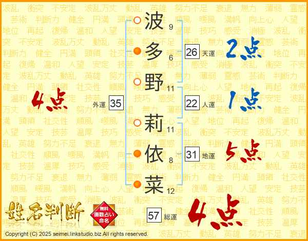 波(9画)多(6画)野(11画) 莉(11画)依(8画)菜(12画)