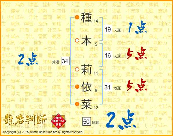 種(14画)本(5画) 莉(11画)依(8画)菜(12画)