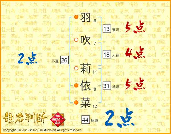 羽(6画)吹(7画) 莉(11画)依(8画)菜(12画)