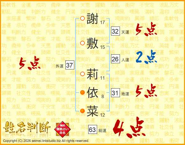 謝(17画)敷(15画) 莉(11画)依(8画)菜(12画)