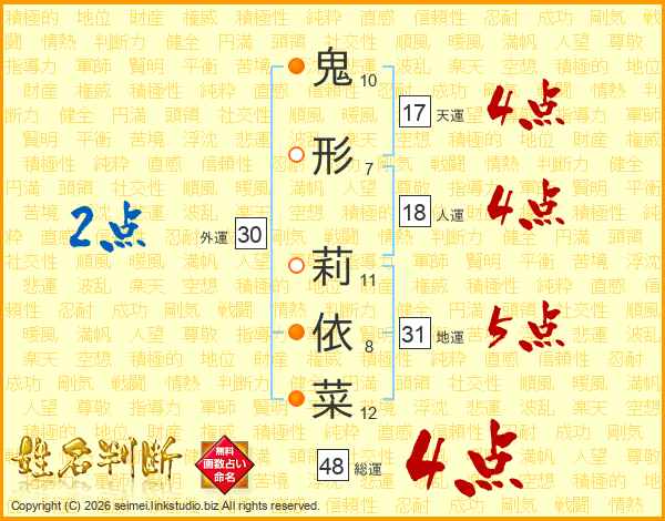 鬼(10画)形(7画) 莉(11画)依(8画)菜(12画)