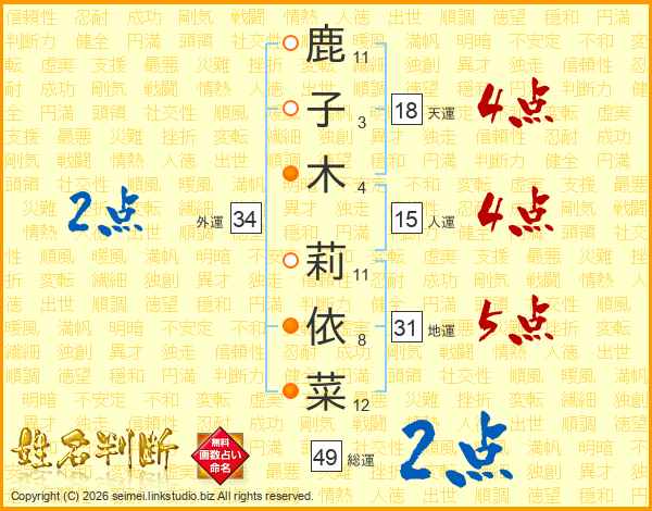 鹿(11画)子(3画)木(4画) 莉(11画)依(8画)菜(12画)