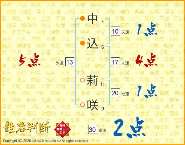 中(4画)込(6画) 莉(11画)咲(9画)