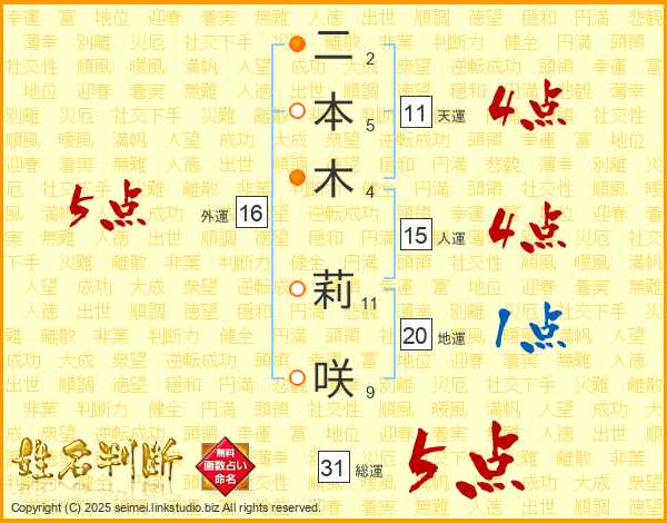 二(2画)本(5画)木(4画) 莉(11画)咲(9画)