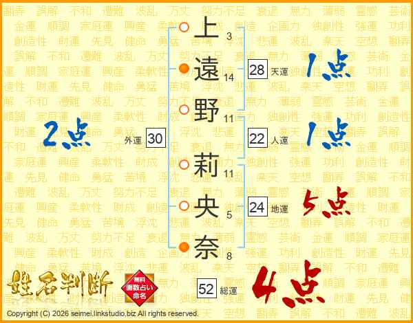 上(3画)遠(14画)野(11画) 莉(11画)央(5画)奈(8画)