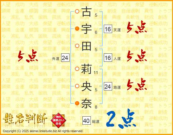 古宇田莉央奈さんの天運は16画の5点!