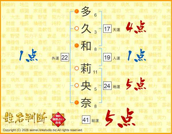 多(6画)久(3画)和(8画) 莉(11画)央(5画)奈(8画)