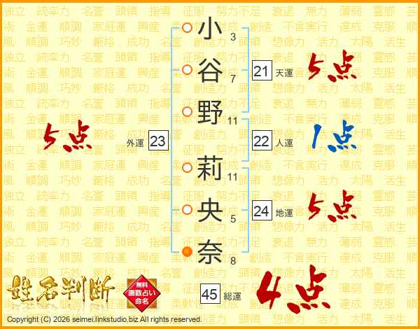 小(3画)谷(7画)野(11画) 莉(11画)央(5画)奈(8画)