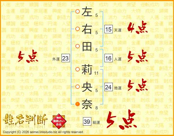 左(5画)右(5画)田(5画) 莉(11画)央(5画)奈(8画)