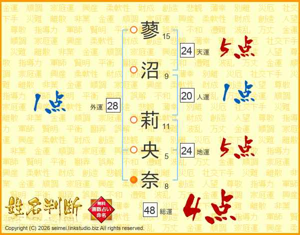 蓼沼莉央奈さんの総運は48画の4点!