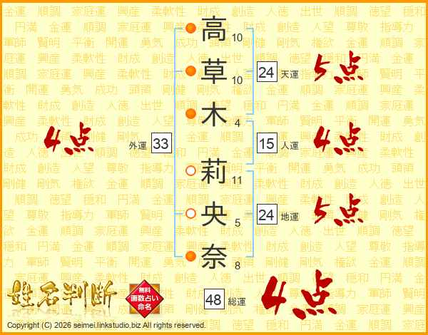 高(10画)草(10画)木(4画) 莉(11画)央(5画)奈(8画)