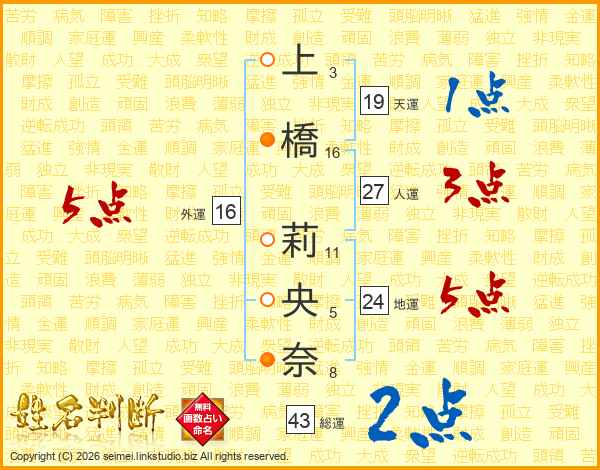 上(3画)橋(16画) 莉(11画)央(5画)奈(8画)