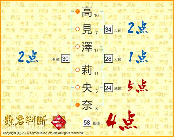 高見澤莉央奈さんの総運は58画の4点!