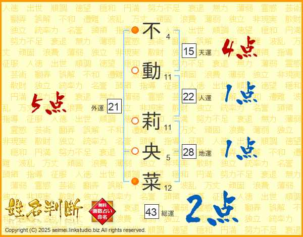 不(4画)動(11画) 莉(11画)央(5画)菜(12画)