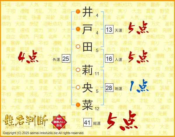 井(4画)戸(4画)田(5画) 莉(11画)央(5画)菜(12画)