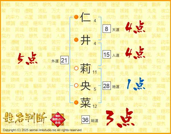 仁(4画)井(4画) 莉(11画)央(5画)菜(12画)