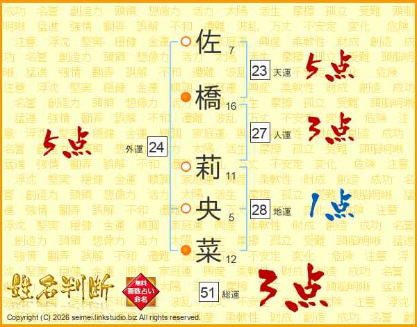 佐橋莉央菜さんの外運は24画の5点!