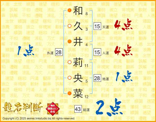 和(8画)久(3画)井(4画) 莉(11画)央(5画)菜(12画)