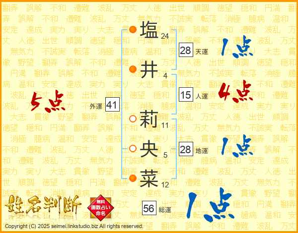 塩(24画)井(4画) 莉(11画)央(5画)菜(12画)