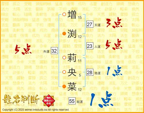 増(15画)渕(12画) 莉(11画)央(5画)菜(12画)